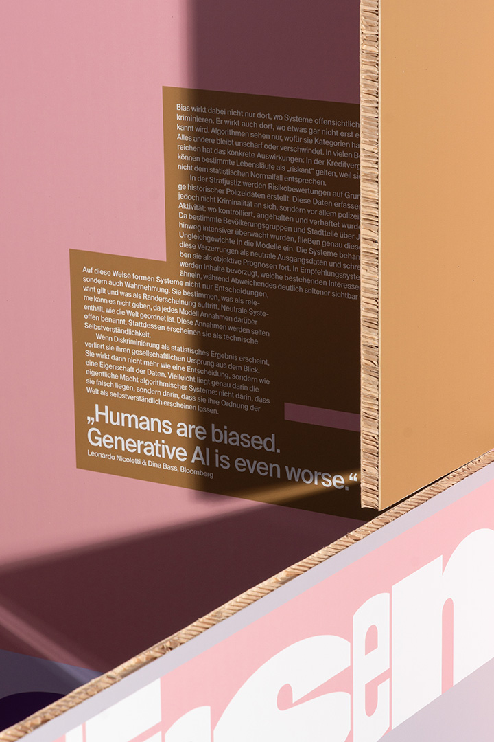 Die Bachelorarbeit „Beneath the Smooth“ nimmt ausgewählte Aspekte dieser digitalen Bedingungen in den Blick – darunter die Erfassung und Verwertung von Daten, algorithmische Sichtbarkeiten, automatisierte Ungleichheiten sowie Künstliche Intelligenz als statistisches Instrument. Diese Phänomene werden nicht isoliert gezeigt, sondern als miteinander verschränkte Strukturen verstanden, die die gesellschaftliche Praxis in einem umfassenden Maß beeinflussen. Im Zentrum steht dabei die Digitalität als kultureller und sozialer Rahmen.